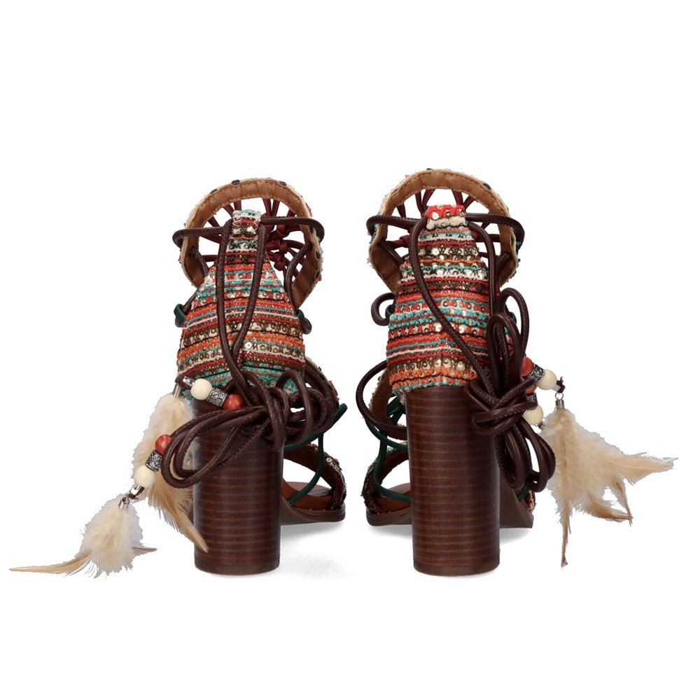 Fabric material sandal with high heel. The front part has a strap attached to another that goes over the instep made of multicolored textile material and the heel is covered by the same material. The entire sandal is decorated with a rope that closes the ankle and has ball decorations and feathers at their ends. Heel height of 10 cm and leather insole.