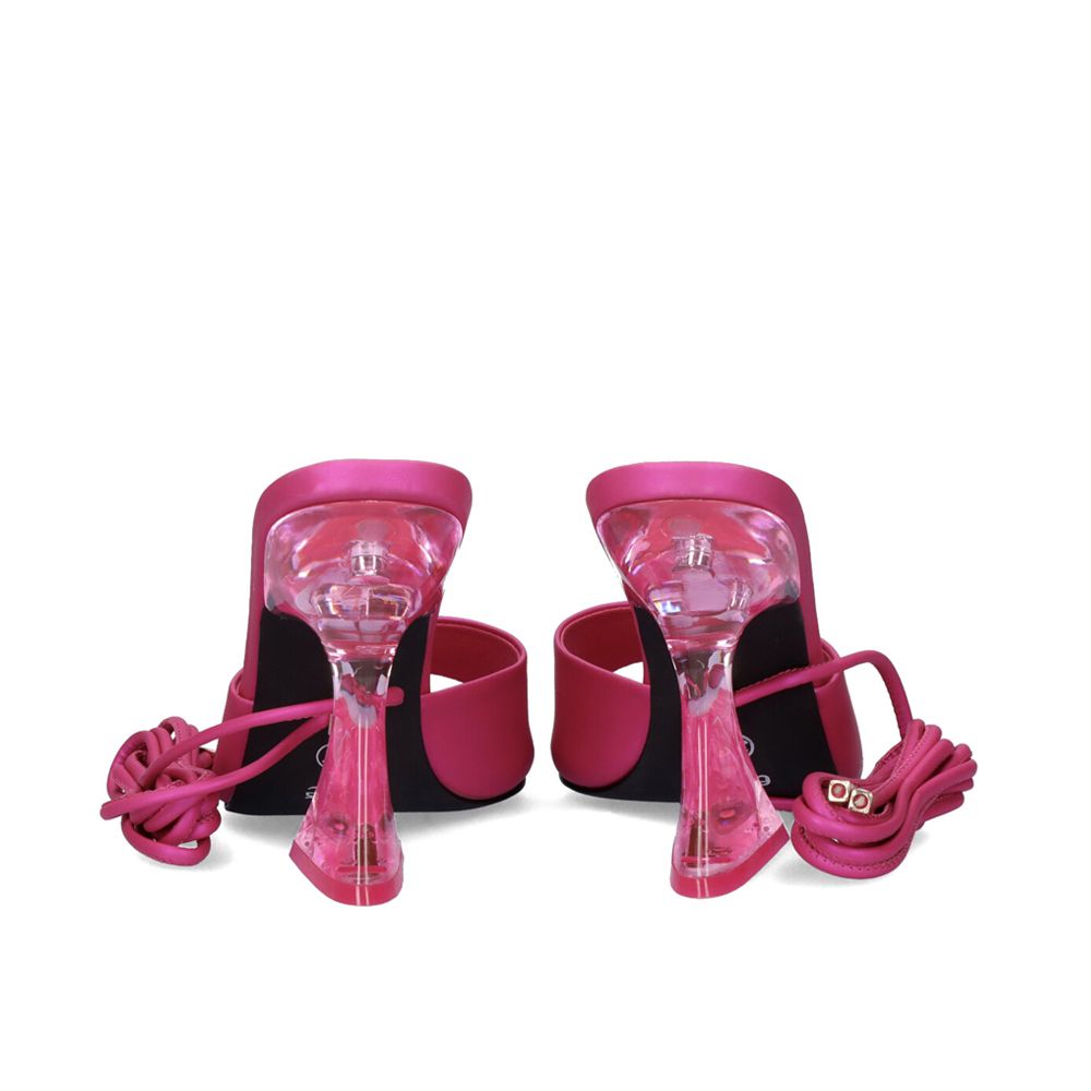 High-heeled sandal, with two possible options, wear it like a flip-flop or the option of tying it to the ankle through strings. Composed of a smooth synthetic upper and leather insole. With heel height of 10 cm