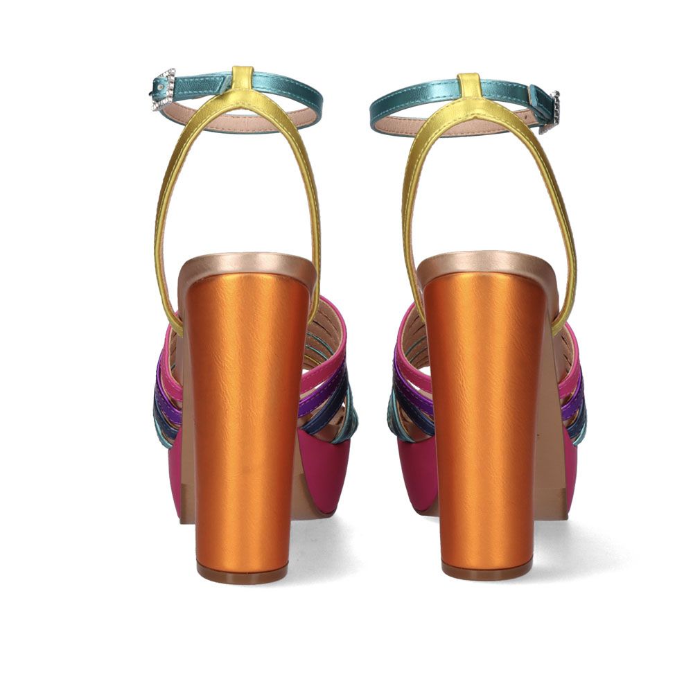 Fuchsia orange high heel sandal. Its cut and sole are made of synthetic material and leather insole.