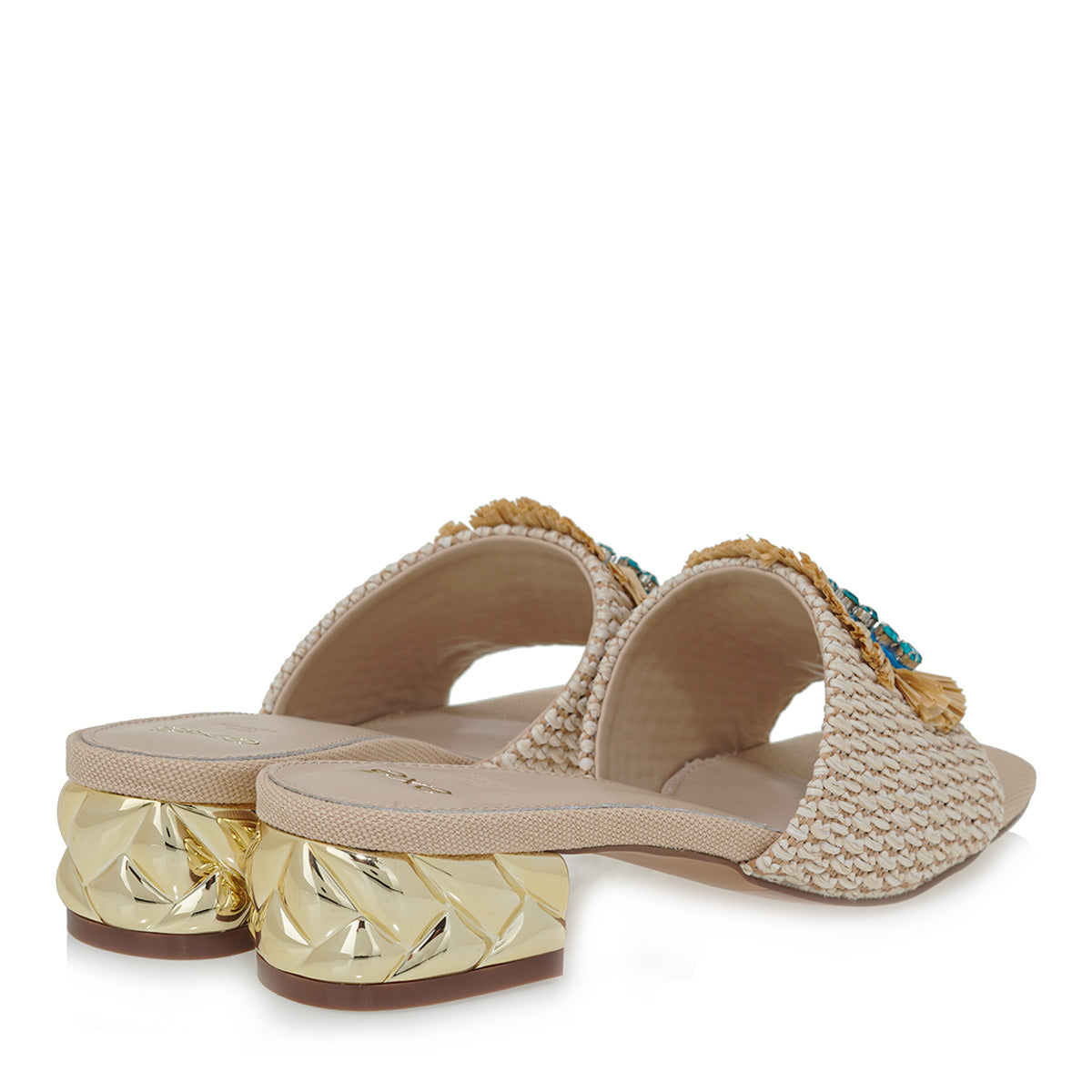 These sandals are expertly designed in Greece to provide both style and functionality. With a low heel and gold heel detailing, these shoes will complement any outfit while the evil eye design ensures protection and positive energy wherever you go.