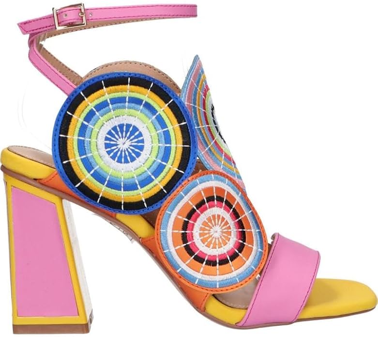 High heeled sandals made of fabric material, leather sole and synthetic sole with predominantly ice color and yellow circular details.
