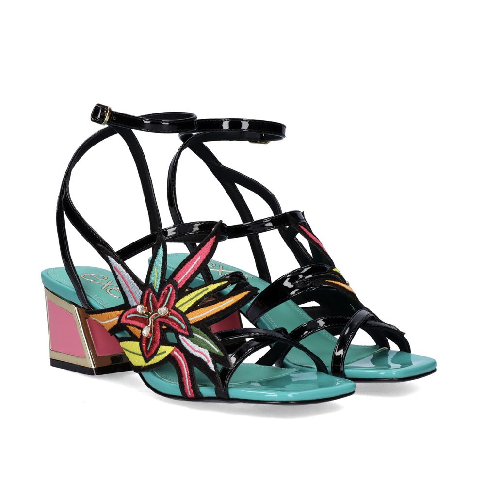 Sandal with a multicolored floral design and embellished with rhinestones . Upper and sole are made of synthetic material and the insole is made of leather.