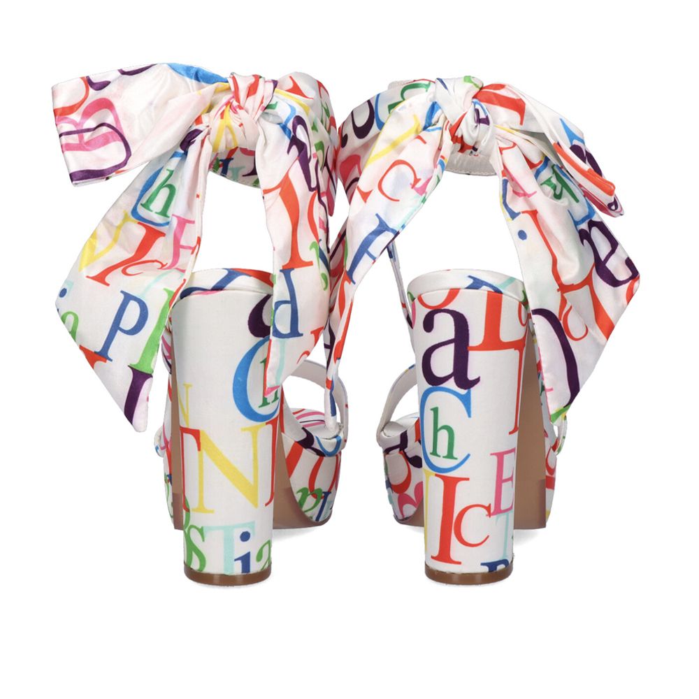 Platform sandal in white color with colorful print. It has a cut and sole of synthetic material, its insole is leather. The heel measures 12 cm, the platform 4 cm and has a decorative bow to the ankle.