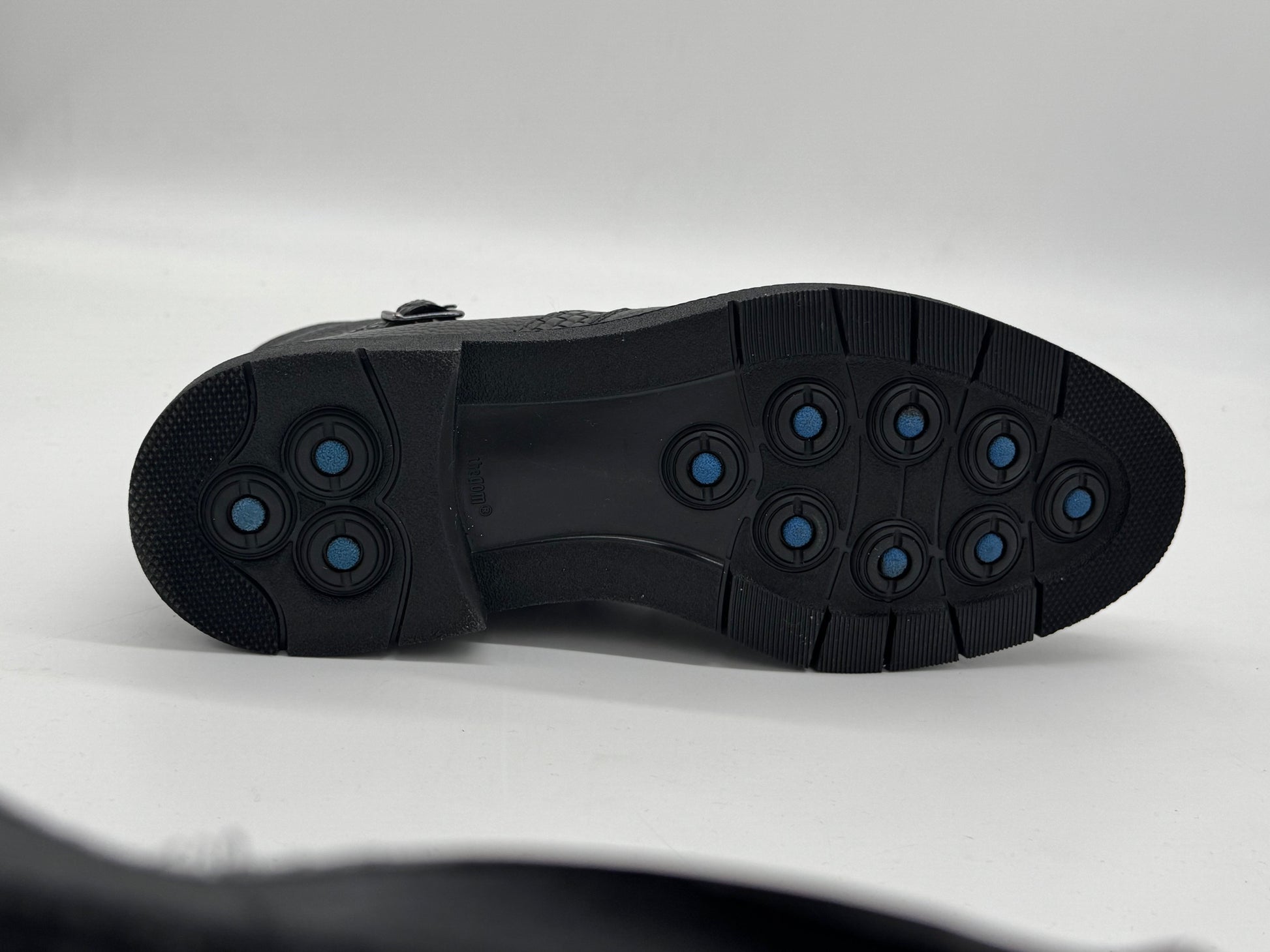 Expertly crafted from supple full-grain leather, it features a refined cap toe and a distinctive woven panel that adds texture and depth. The side buckle detail gives it a contemporary European flair, while the inside zipper ensures easy wear without compromising the clean silhouette.