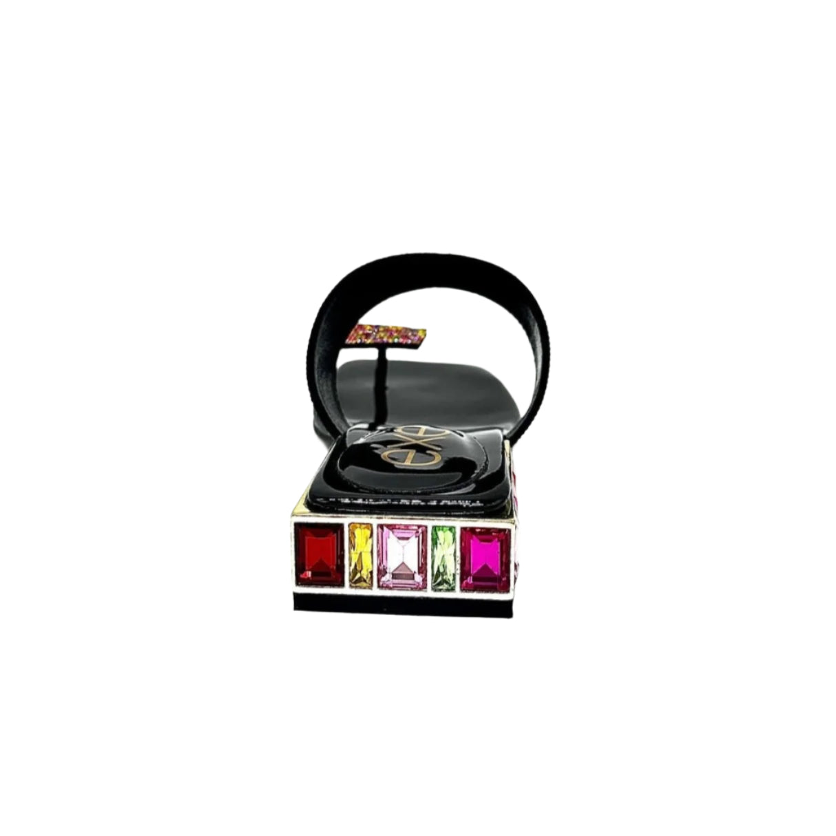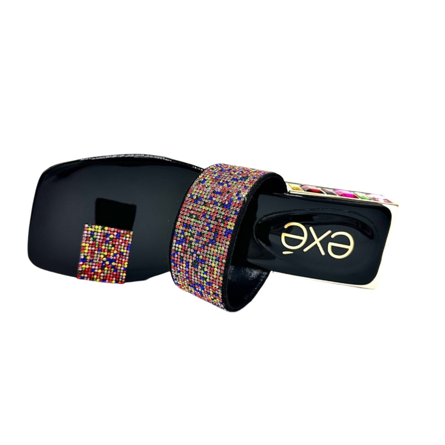 Black patent with multi color stones.
